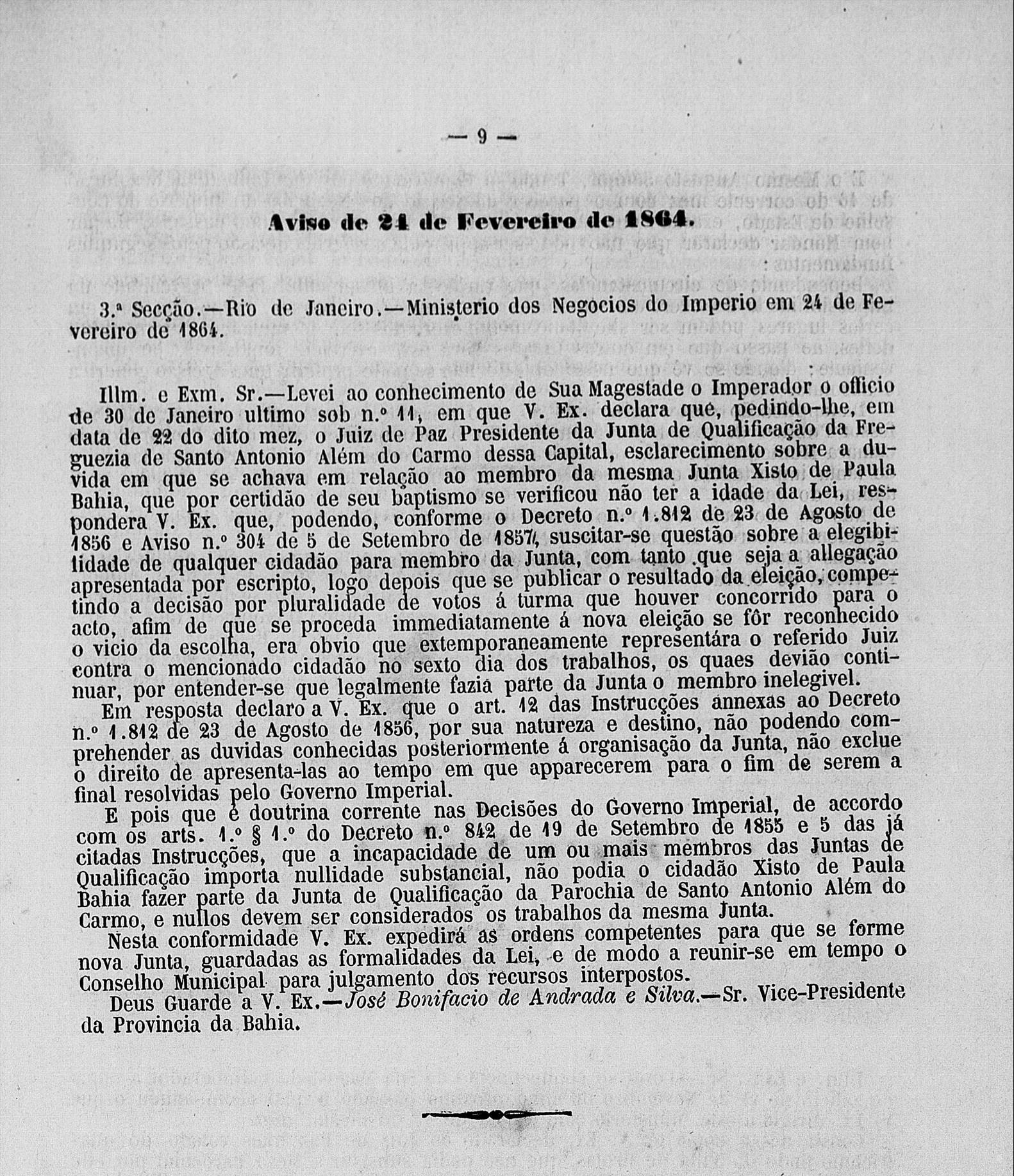 Resposta do então Ministro do Império, José Bonifácio de Andrada e Silva, ao "officio" enviado pelo Vice-Presidente da Província da Bahia no dia 30/01/1864 a respeito da possível "nullidade" das atividades da Junta de Qualificação da Freguezia de Santo Antonio Além do Carmo por Xisto Bahia (então membro) ser menor de 25 anos.