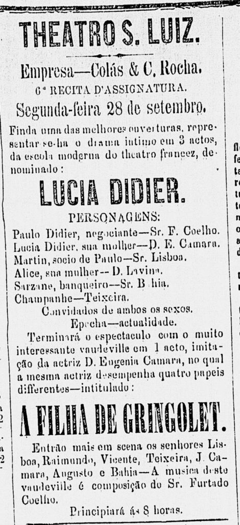 Theatro S. Luiz Voltar Publicador_Maranhense_25091863_p03 Metadados TítuloTheatro S. LuizTítulo da PublicaçãoPublicador MaranhenseResumoAnúncio da "6ª Recita D'Assignatura" da Empresa Colás & C. Rocha com estreia do drama "intimo" Lucia Didier e segunda apresentação do vaudeville "A Filha de Gringolet", em uma segunda-feira dia 28/09/1863.Data25/09/1863Página(s)4Edição216Seção3/4LocalSão Luís, MAIdiomaPortuguêsLink de Pesquisahttp://memoria.bn.br/DocReader/720089/14685?pesq=bahiaUrl (ou Permalink)http://memoria.bn.br/DocReader/720089/14685FonteHemeroteca Digital da Biblioteca NacionalClassificaçãoHemeroteca > Chamada de espetáculo(s) Continuar navegando Theatro S. Luiz A disseminação do lundu ”Isto é bom”: um estudo comparativo de gravações e de registros gráficos Voltar para a lista de itens